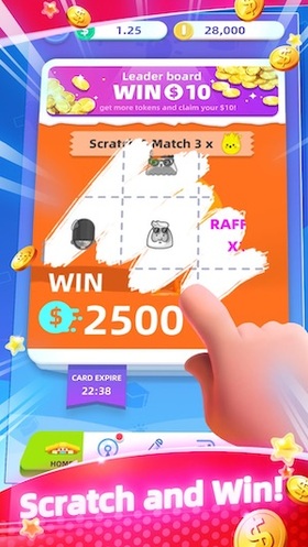 - Tokens: Tokens are a kind of ‘virtual currency’ used by the app. They are won from scratch cards, given as prizes for logging into the app daily, and can be gained using any of the additional features listed below. These tokens can be redeemed for entries into the raffle draws held by the app or to play in any of the extra games.